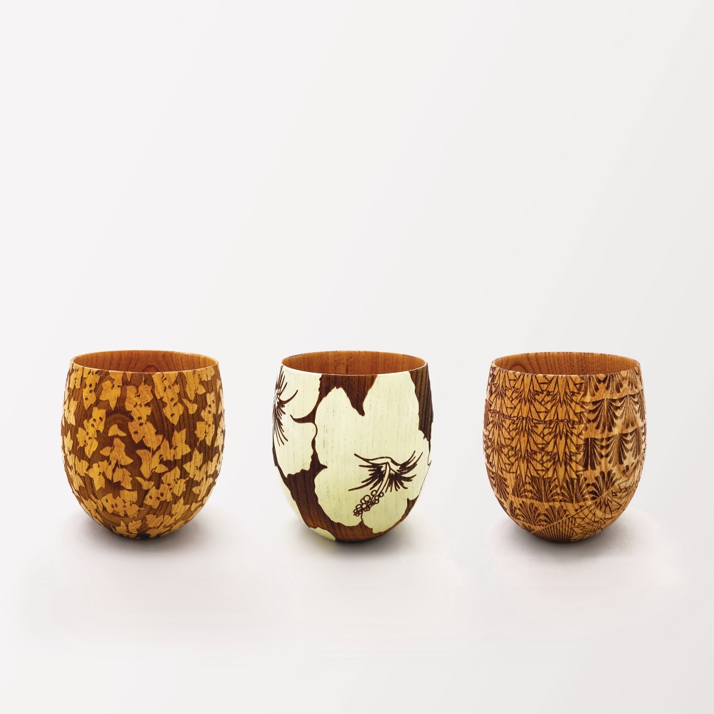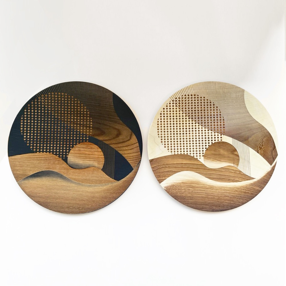 京友禅の型などを製作される三彩工房さんとのコラボレーション作品です。 何度も試行錯誤を重ね、繊細で精密なレーザー彫刻を実現しました。 美しいグラデーションや凹凸の深さで表現したグラフィックは、職人の伝統芸と最新技術の成せる技です。