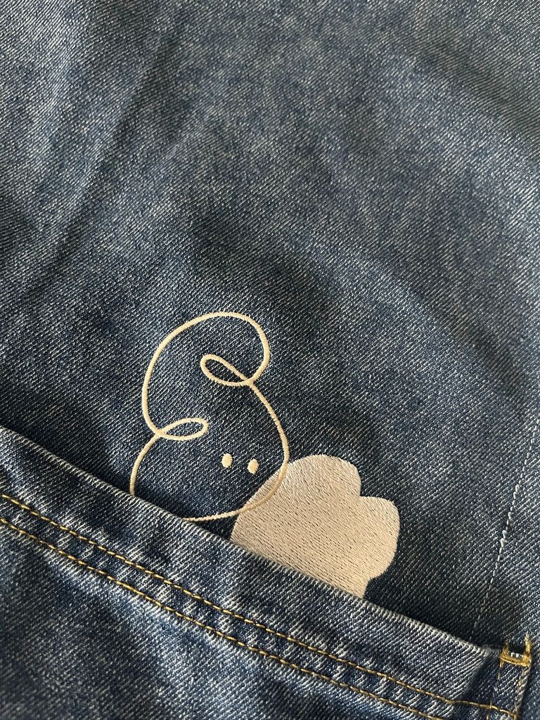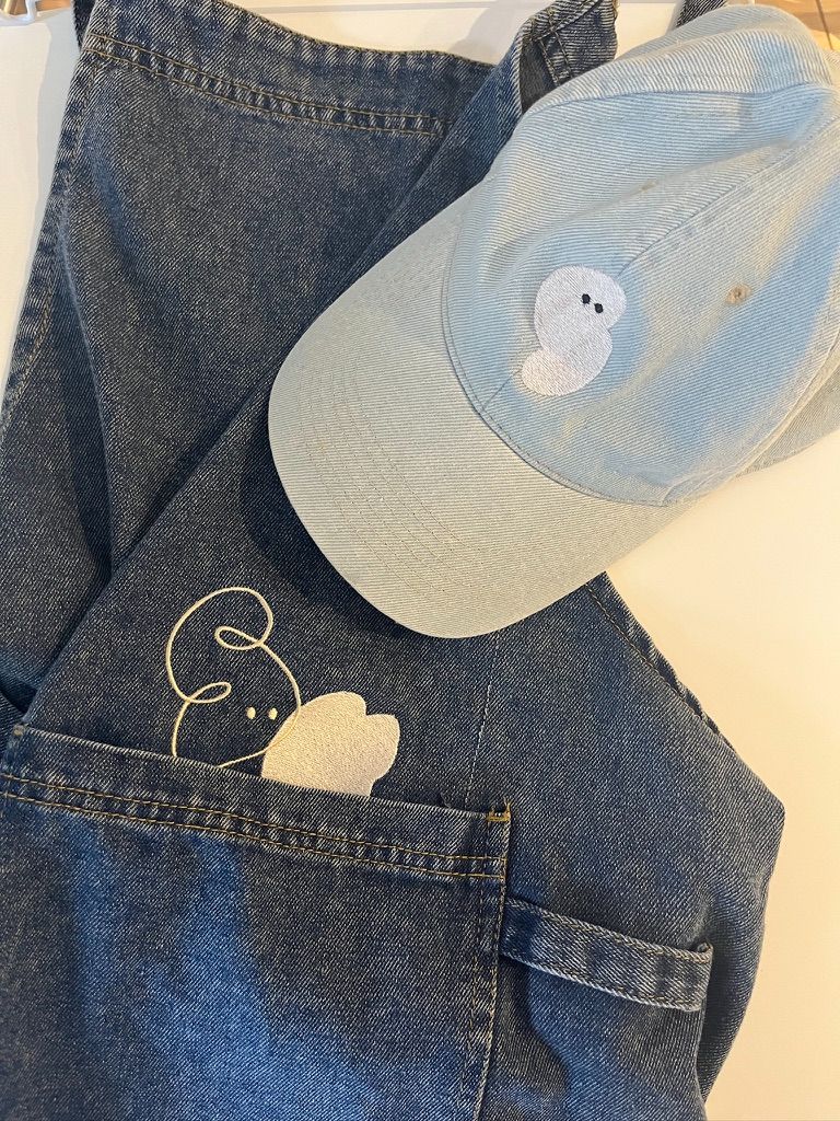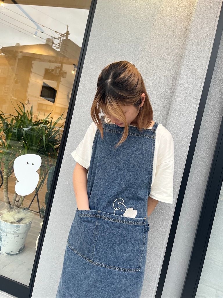 see em why kがブランディング、プロデュースしたジェラートショップ、『Scoop』のオリジナルキャラクター『Scoopy』の刺繍が入ったデニムエプロンです。